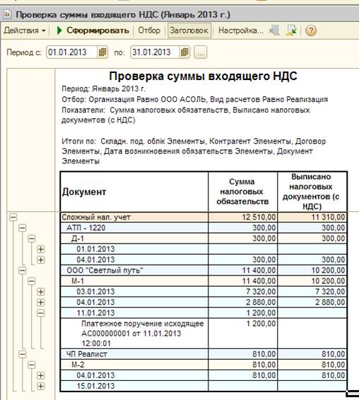 Сформировать отчет "Проверка суммы обязательств по НДС".