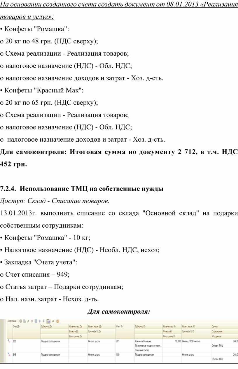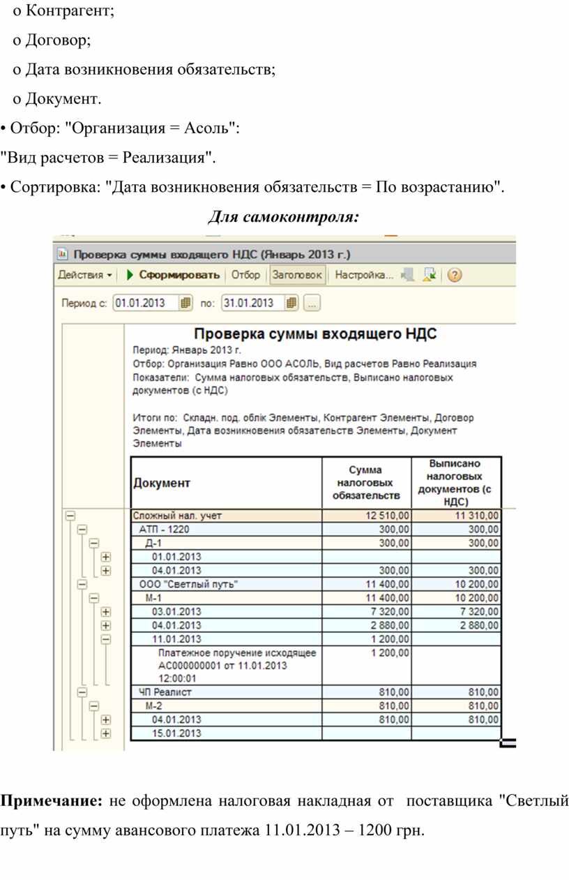 Примечание: не оформлена налоговая накладная от поставщика "Светлый путь" на сумму авансового платежа 11.01.2013 – 1200 грн.