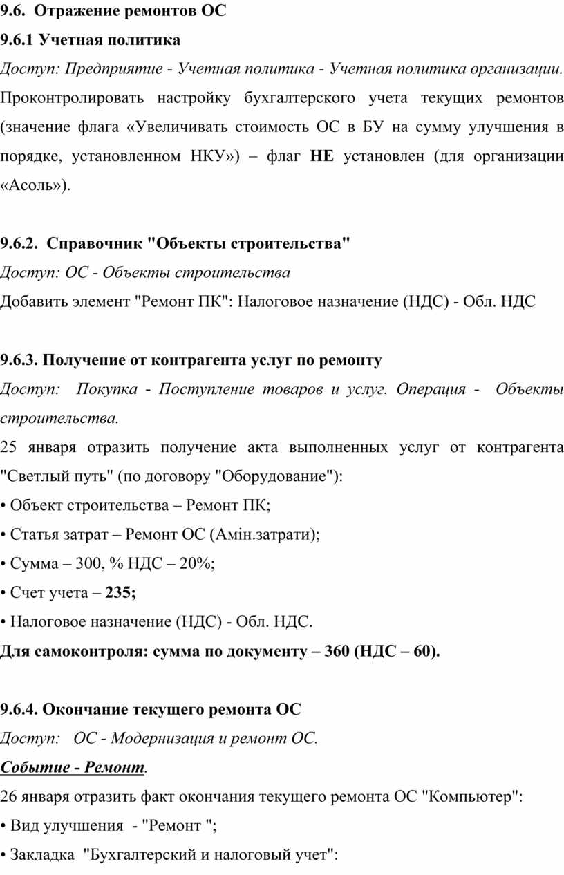 Проконтролировать настройку бухгалтерского учета текущих ремонтов (значение флага «Увеличивать стоимость OC в БУ на сумму улучшения в порядке, установленном НКУ») – флаг НЕ установлен (для организации «Асоль»).