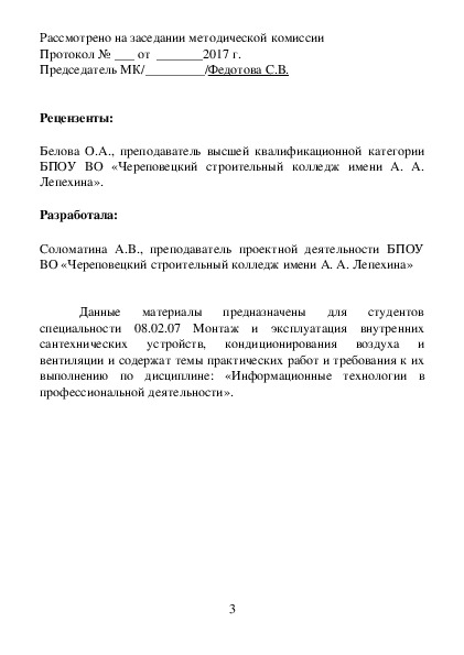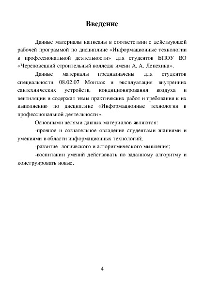Данные материалы написаны в соответствии с действующей рабочей программой по дисциплине «Информационные технологии в профессиональной деятельности» для студентов БПОУ ВО «Череповецкий строительный колледж имени А. А. Лепехина».