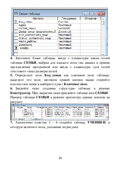 таблицы СЕМЬИ, выбрав для каждого поля тип данных и приняв