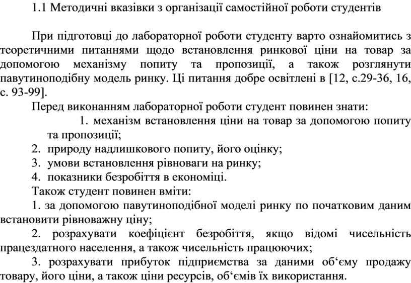 При підготовці до лабораторної роботи студенту варто ознайомитись з теоретичними питаннями щодо встановлення ринкової ціни на товар за допомогою механізму попиту та пропозиції, а також розглянути павутиноподібну модель ринку. Ці питання добре освітлені в [12, с.29-36, 16, с. 93-99].