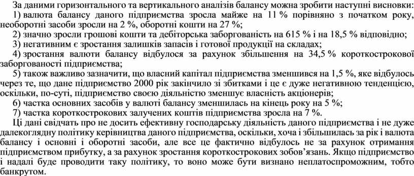 Ці дані свідчать про не досить ефективну господарську діяльність даного підприємства і не дуже далекоглядну політику керівництва даного підприємства, оскільки, хоча і збільшилась за рік і валюта балансу і основні і оборотні засоби, але все це фактично відбулось не за рахунок отримання підприємством прибутку, а за рахунок зростання короткострокових зобов’язань. Якщо підприємство і надалі буде проводити таку політику, то воно може бути визнано неплатоспроможним, тобто банкрутом.