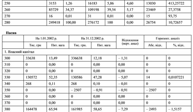 Першим напрямком аналізу є горизонтальний та вертикальний аналіз балансу Ф. № 1., який характеризує структурні зміни ресурсів (активів) та власності (пасивів) за двома ознаками: зміни за характером збільшення або зменшення та питому вагу кожного складового елементу.