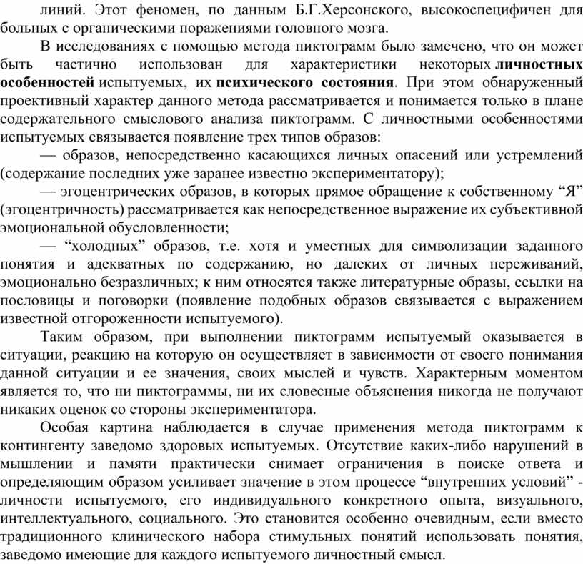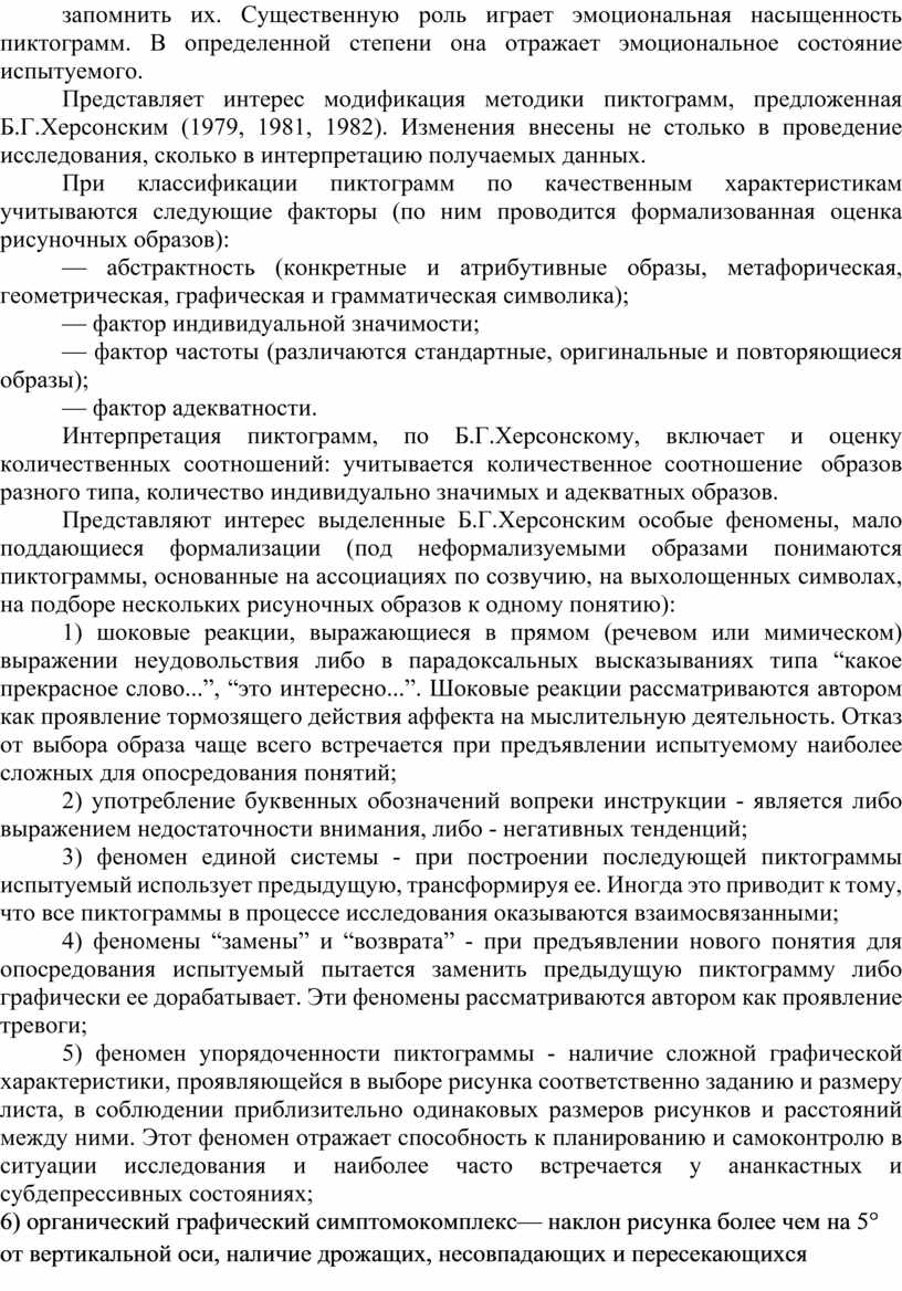 Представляет интерес модификация методики пиктограмм, предложенная Б.Г.Херсонским (1979, 1981, 1982). Изменения внесены не столько в проведение исследования, сколько в интерпретацию получаемых данных.