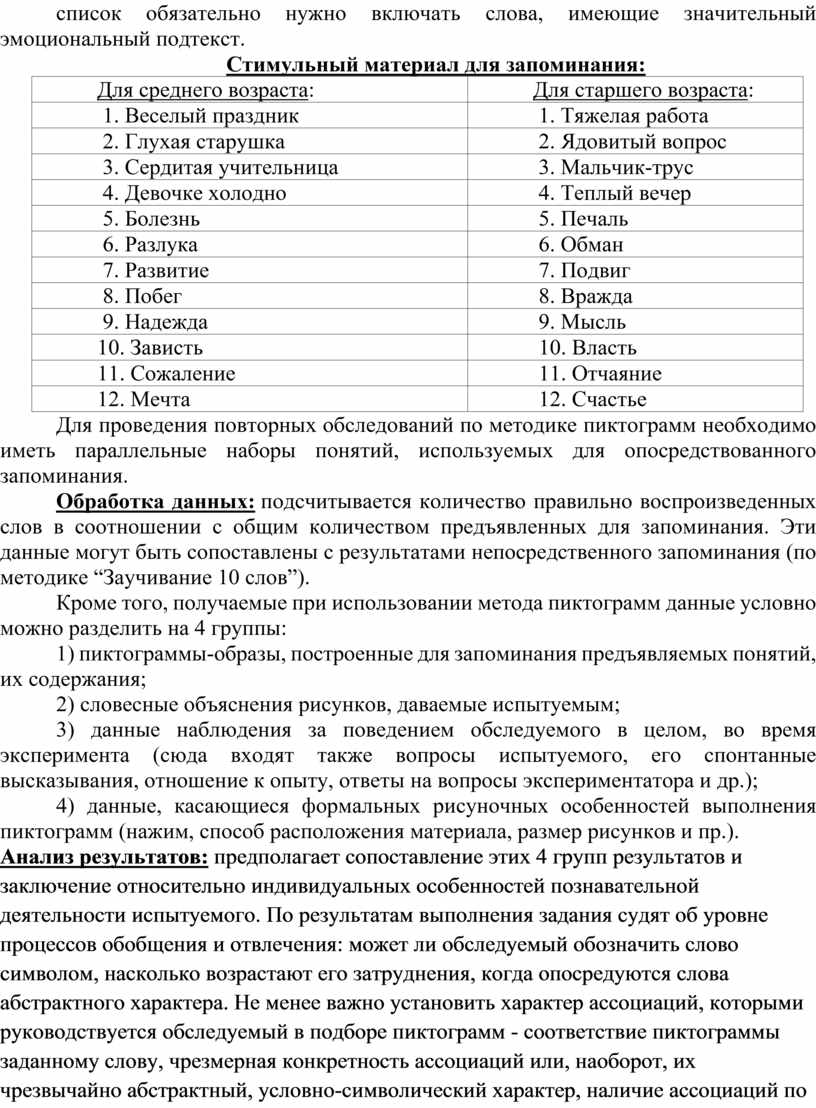 Для проведения повторных обследований по методике пиктограмм необходимо иметь параллельные наборы понятий, используемых для опосредствованного запоминания.