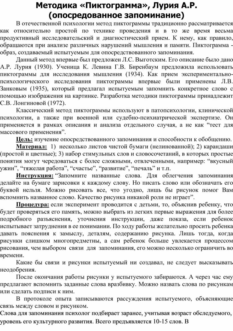 Методика «Пиктограмма», Лурия А.Р. (опосредованное запоминание)