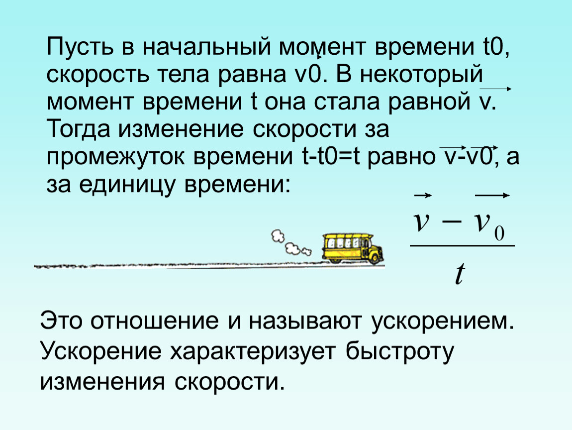 Пусть в начальный момент времени t0, скорость тела равна v0. В некоторый момент времени t она стала равной v. Тогда изменение скорости за промежуток времени t-t0=t равно v-v0, а за единицу времени: