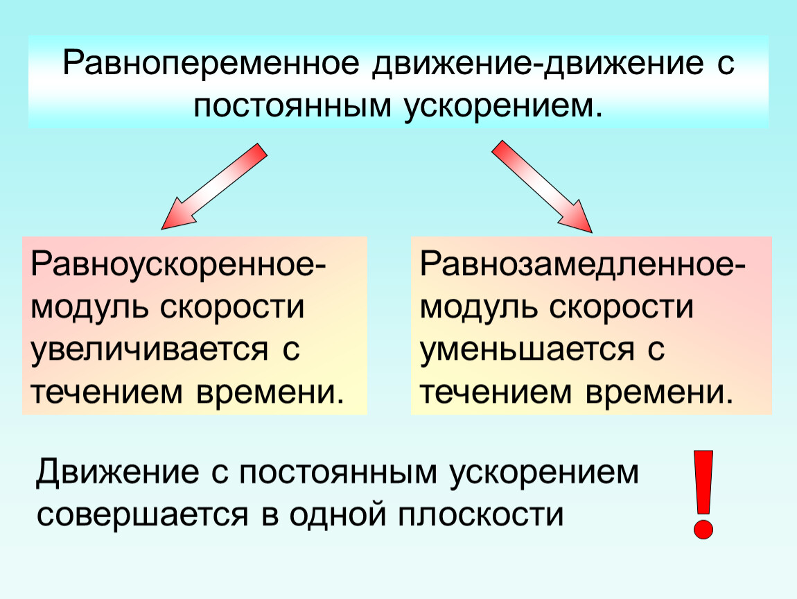 Равноускоренное- модуль скорости увеличивается с течением времени.