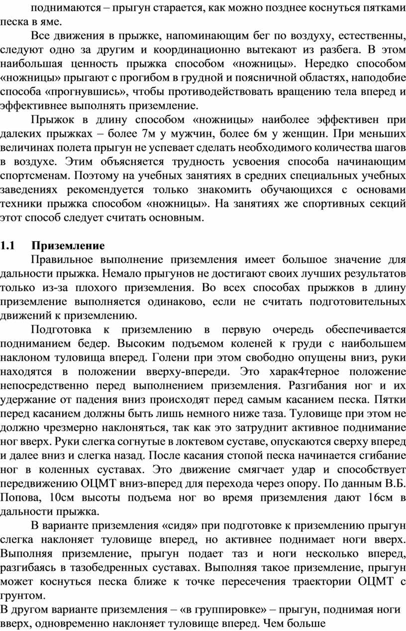 Подготовка к приземлению в первую очередь обеспечивается подниманием бедер. Высоким подъемом коленей к груди с наибольшем наклоном туловища вперед. Голени при этом свободно опущены вниз, руки находятся в положении вверху-впереди. Это харак4терное положение непосредственно перед выполнением приземления. Разгибания ног и их удержание от падения вниз происходят перед самым касанием песка. Пятки перед касанием должны быть лишь немного ниже таза. Туловище при этом не должно чрезмерно наклоняться, так как это затруднит активное поднимание ног вверх. Руки слегка согнутые в локтевом суставе, опускаются сверху вперед и далее вниз и слегка назад. После касания стопой песка начинается сгибание ног в коленных суставах. Это движение смягчает удар и способствует передвижению ОЦМТ вниз-вперед для перехода через опору. По данным В.Б. Попова, 10см высоты подъема ног во время приземления дают 16см в дальности прыжка.