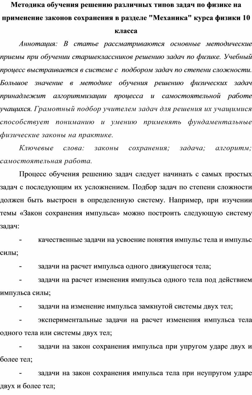 Ключевые слова: законы сохранения; задача; алгоритм; самостоятельная работа.
