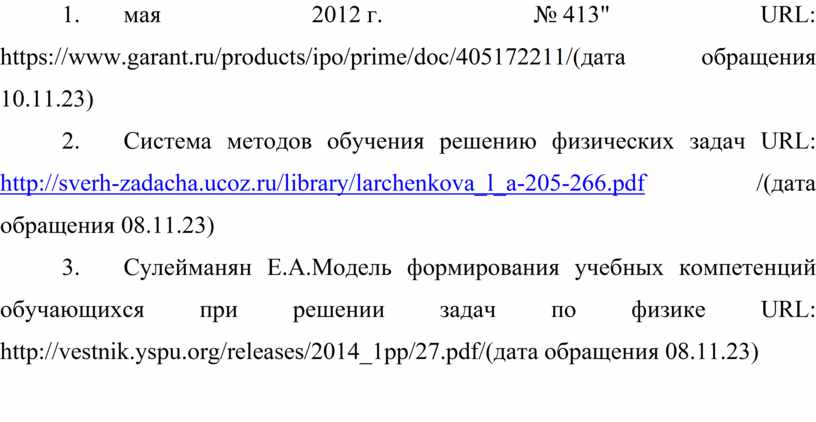 11. Сулейманян Е.А.Модель формирования учебных компетенций обучающихся при решении задач по физике URL: http://vestnik.yspu.org/releases/2014_1pp/27.pdf/(дата обращения 08.11.23)