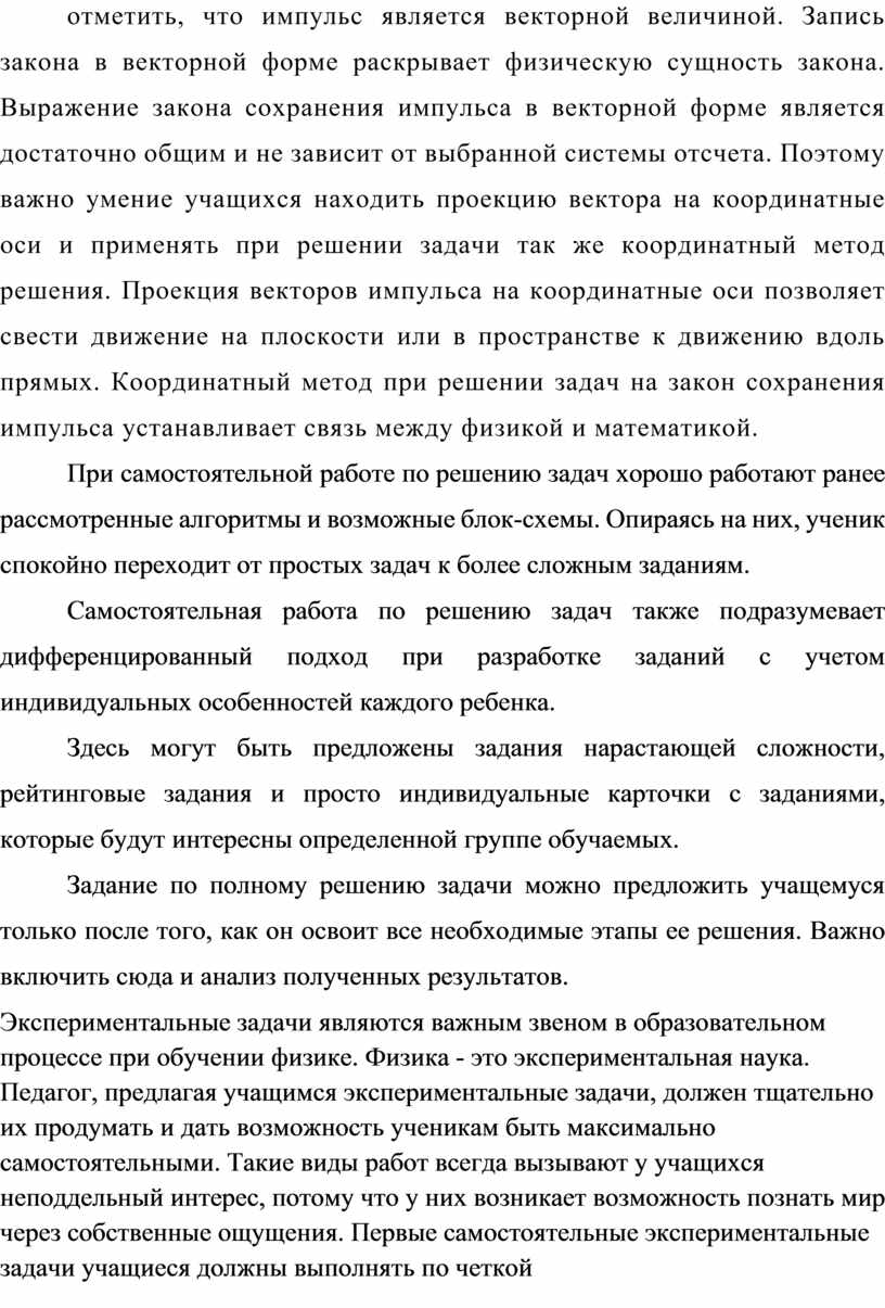При решении задач на закон сохранения импульса важно отметить, что импульс является векторной величиной. Запись закона в векторной форме раскрывает физическую сущность закона. Выражение закона сохранения импульса в векторной форме является достаточно общим и не зависит от выбранной системы отсчета. Поэтому важно умение учащихся находить проекцию вектора на координатные оси и применять при решении задачи так же координатный метод решения. Проекция векторов импульса на координатные оси позволяет свести движение на плоскости или в пространстве к движению вдоль прямых. Координатный метод при решении задач на закон сохранения импульса устанавливает связь между физикой и математикой.