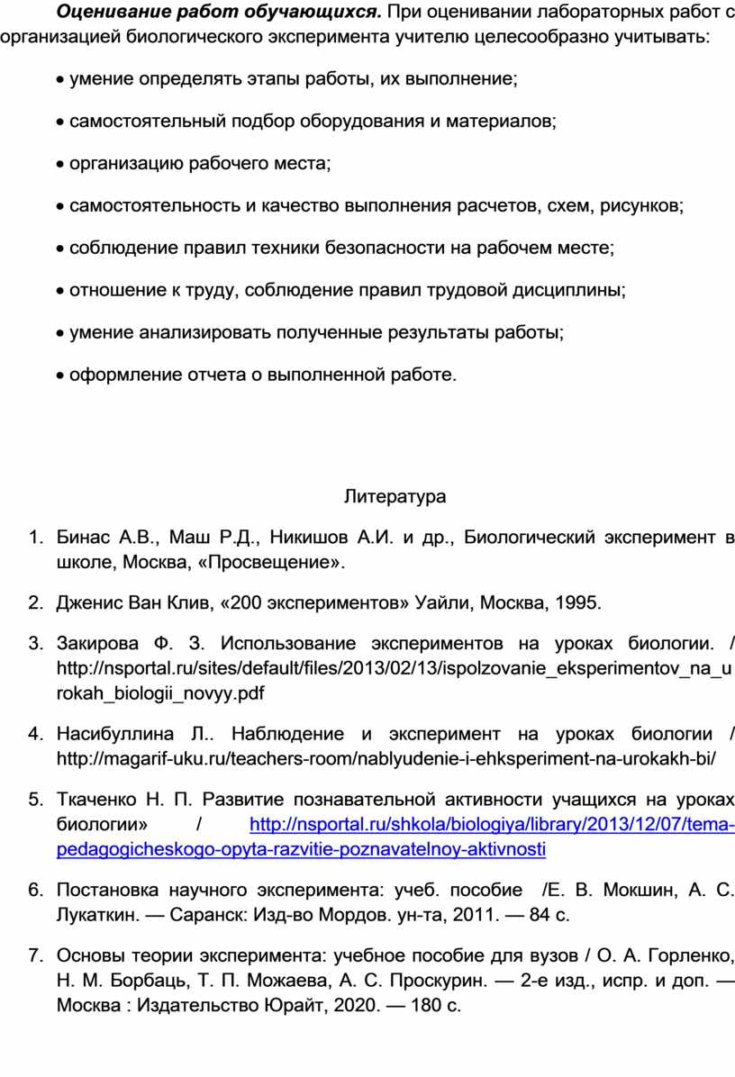 Оценивание работ обучающихся. При оценивании лабораторных работ с организацией биологического эксперимента учителю целесообразно учитывать: