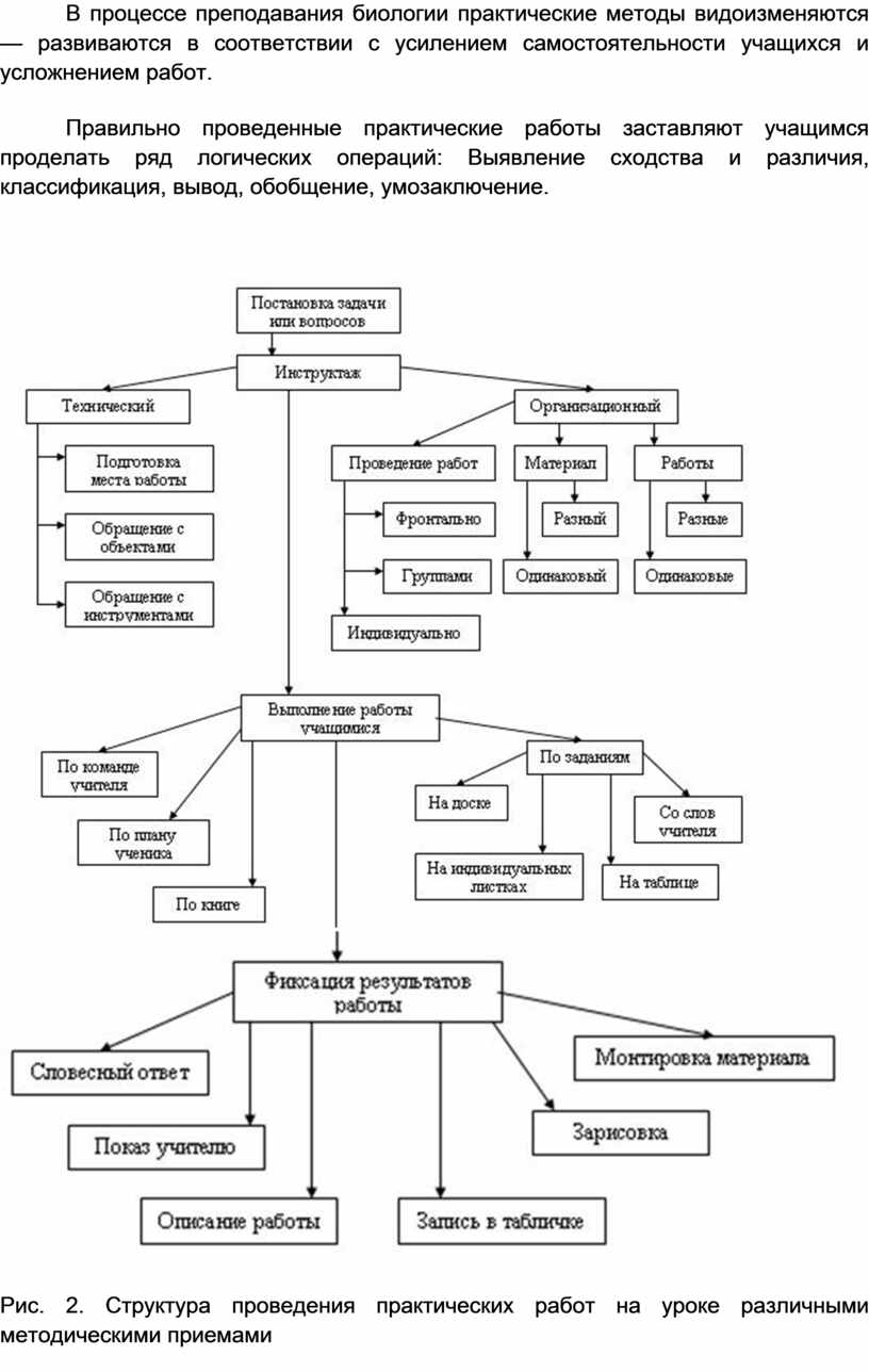 Любой из методов осуществляется в практике преподавания приемами. Методические приемы — элементы того или иного метода, выражающие отдельные действия учителя и учащихся в процессе преподавания. Они могут носить логический, организационный и технический характер. На рис. 2 изображена структура проведения практических работ на уроке различными методическими приемами.