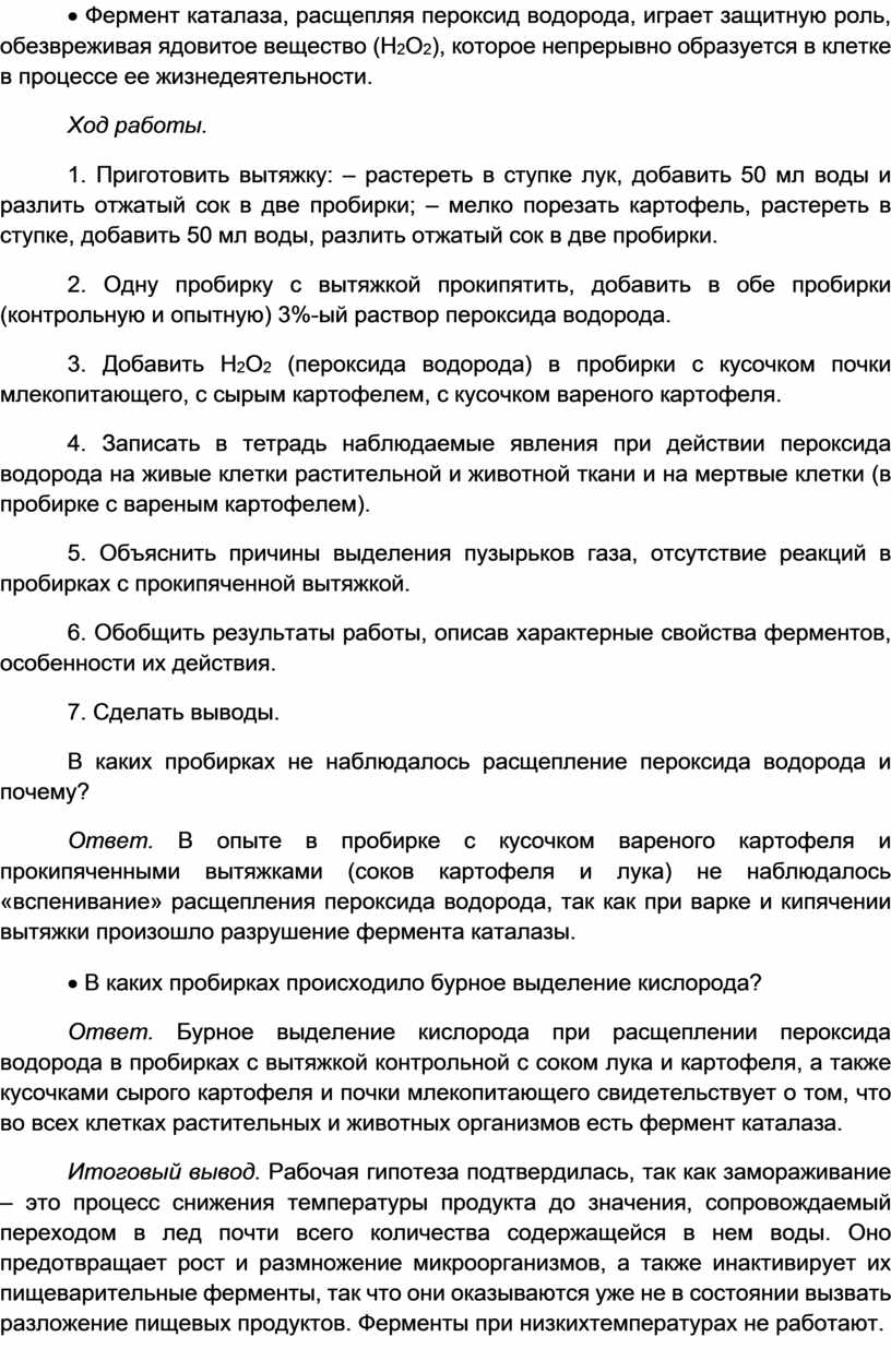 Цель: познакомиться с ферментативным характером реакций обмена веществ, доказать, что ферментативная активность – свойство, присущее только живой клетке, продолжить формирование умений по составлению схемы и проведению простейших цитологических опытов.
