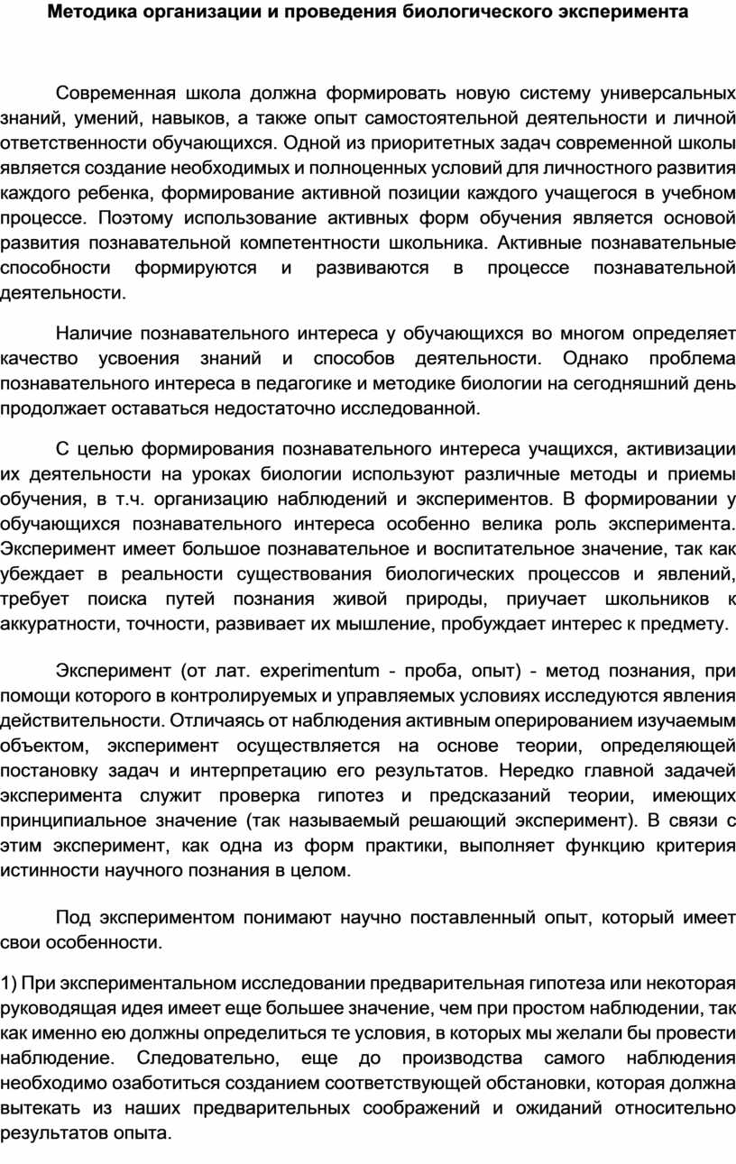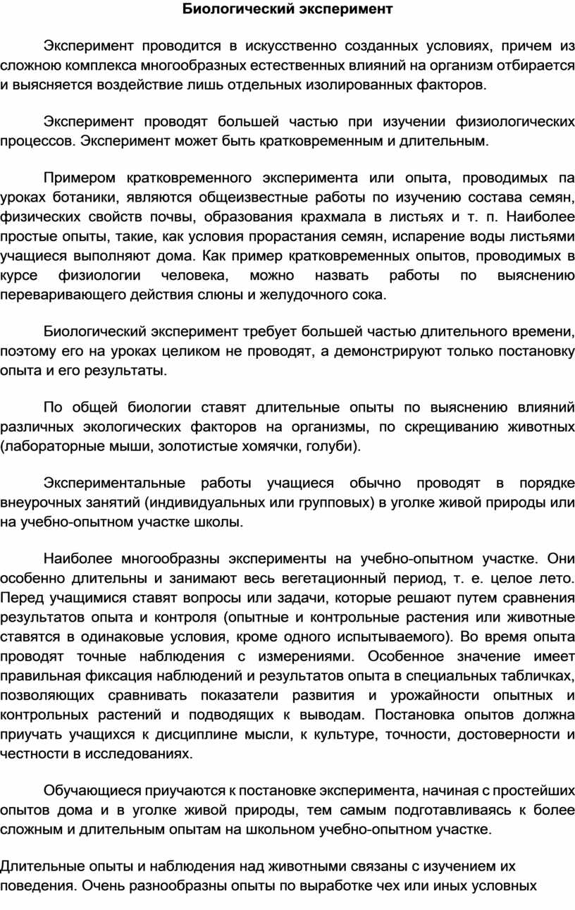 Биологический эксперимент требует большей частью длительного времени, поэтому его на уроках целиком не проводят, а демонстрируют только постановку опыта и его результаты.