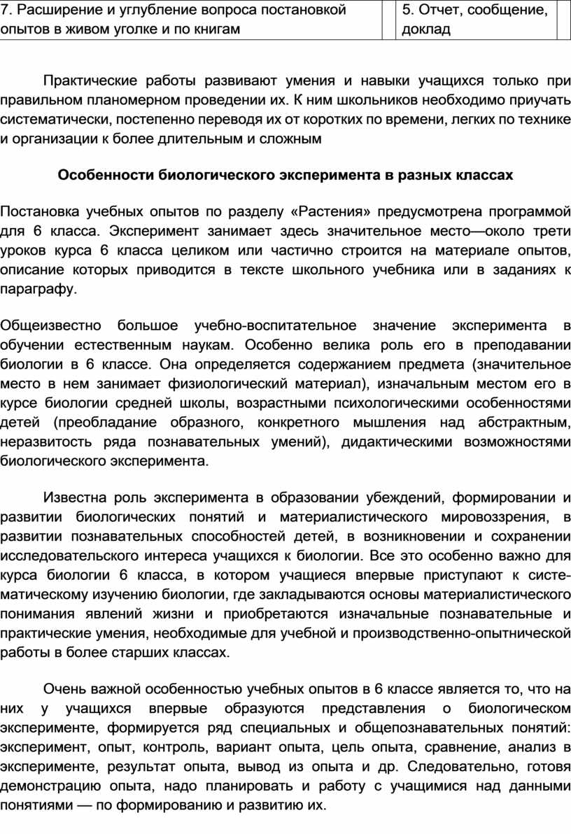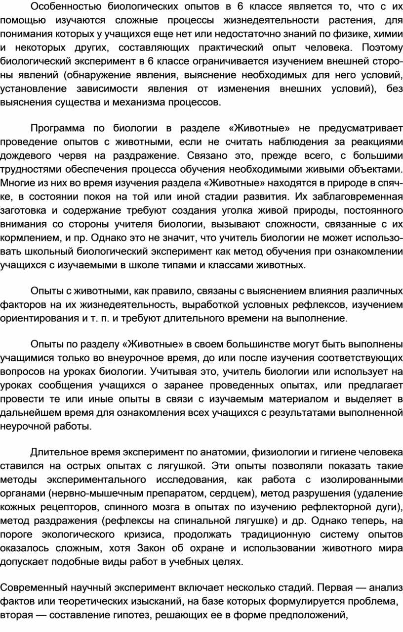 Общеизвестно большое учебно-воспитательное значение эксперимента в обучении естественным наукам. Особенно велика роль его в преподавании биологии в 6 классе. Она определяется содержанием предмета (значительное место в нем занимает физиологический материал), изначальным местом его в курсе биологии средней школы, возрастными психологическими особенностями детей (преобладание образного, конкретного мышления над абстрактным, неразвитость ряда познавательных умений), дидактическими возможностями биологического эксперимента.