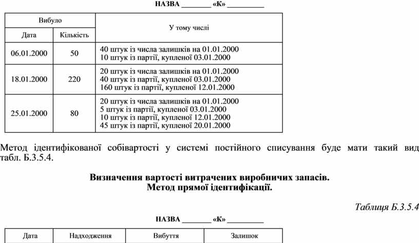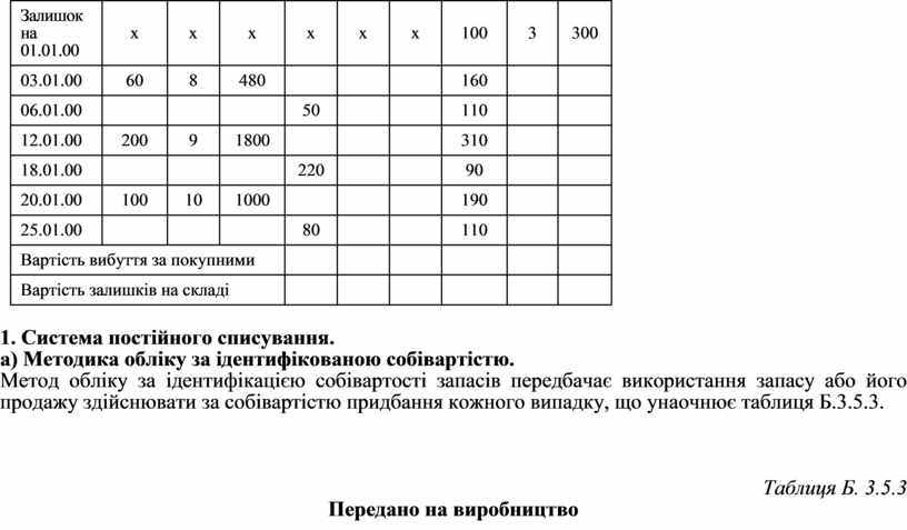Метод обліку за ідентифікацією собівартості запасів передбачає використання запасу або його продажу здійснювати за собівартістю придбання кожного випадку, що унаочнює таблиця Б.3.5.3.