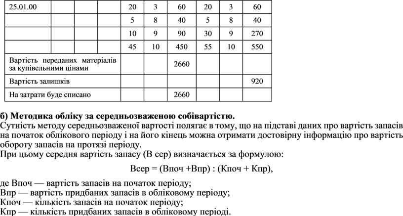 Сутність методу середньозваженої вартості полягає в тому, що на підставі даних про вартість запасів на початок облікового періоду і на його кінець можна отримати достовірну інформацію про вартість обороту запасів на протязі періоду.
