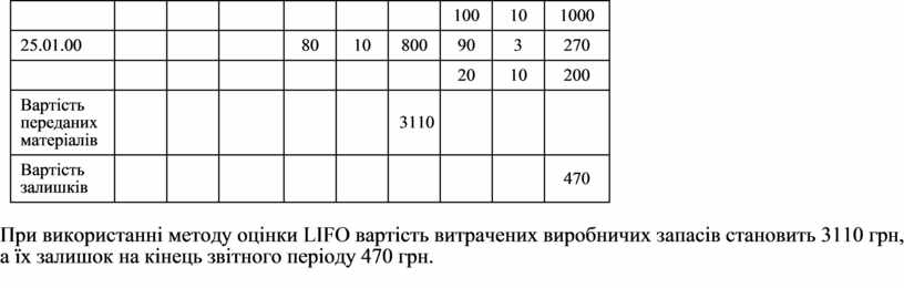 При використанні методу оцінки LIFO вартість витрачених виробничих запасів становить 3110 грн, а їх залишок на кінець звітного періоду 470 грн.
