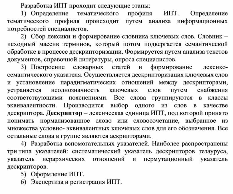 Методика построения ИПЯ дескрипторного типа. Основу ИЯ дескрипторного типа составляет информационно-поисковый тезаурус (ИПТ), который предназначен для контроля лексики языка. ИПТ – контролируемый словарь лексических единиц дескрипторного языка, основанный на лексике одного естественного языка, отображающий семантические отношения между лексическими единицами и предназначенный для организации поиска информации путем индексирования документов и/или запросов.