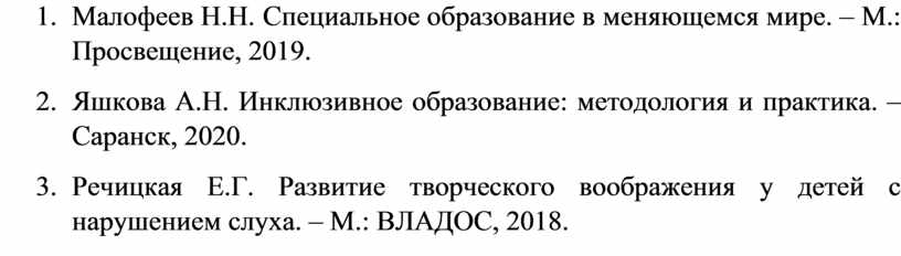 2. Малофеев Н.Н. Специальное образование в меняющемся мире. – М.: Просвещение, 2019.