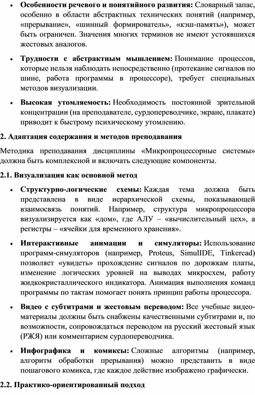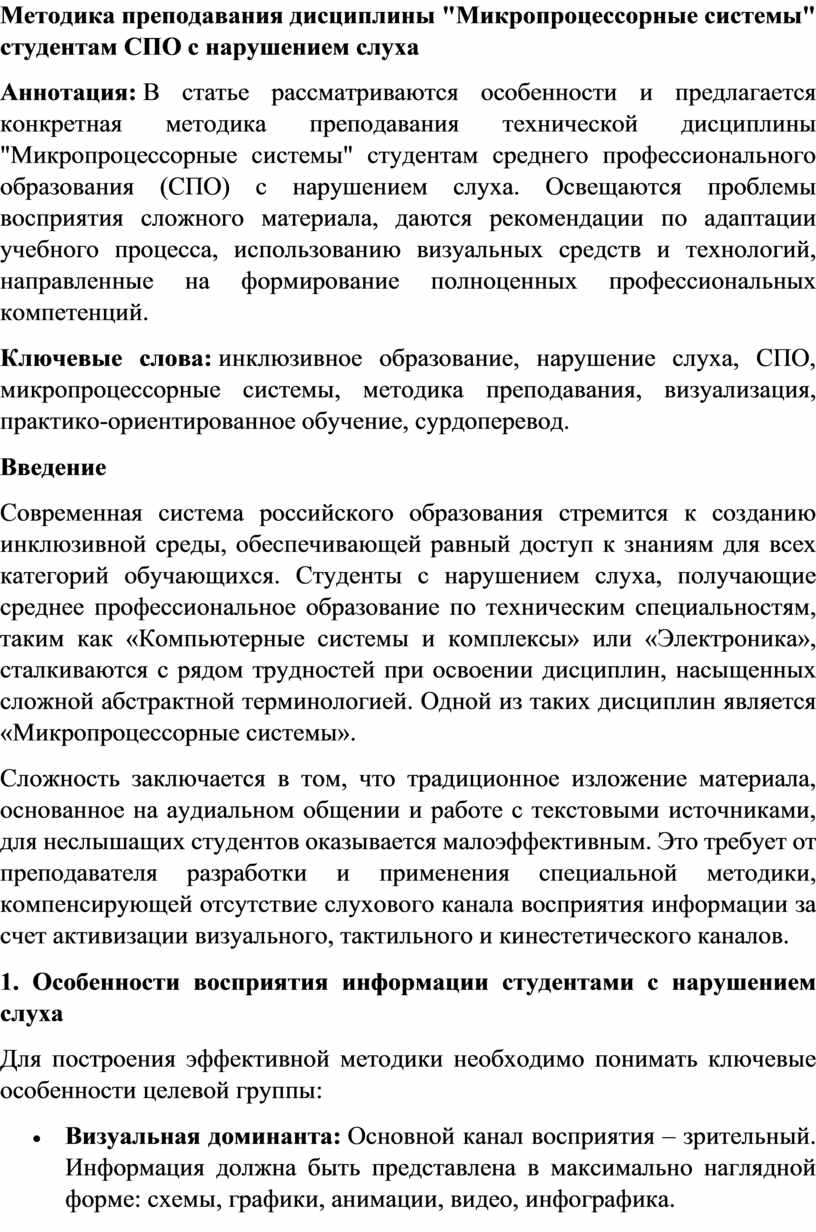 Современная система российского образования стремится к созданию инклюзивной среды, обеспечивающей равный доступ к знаниям для всех категорий обучающихся. Студенты с нарушением слуха, получающие среднее профессиональное образование по техническим специальностям, таким как «Компьютерные системы и комплексы» или «Электроника», сталкиваются с рядом трудностей при освоении дисциплин, насыщенных сложной абстрактной терминологией. Одной из таких дисциплин является «Микропроцессорные системы».