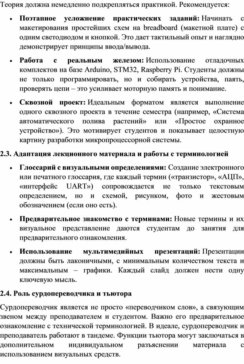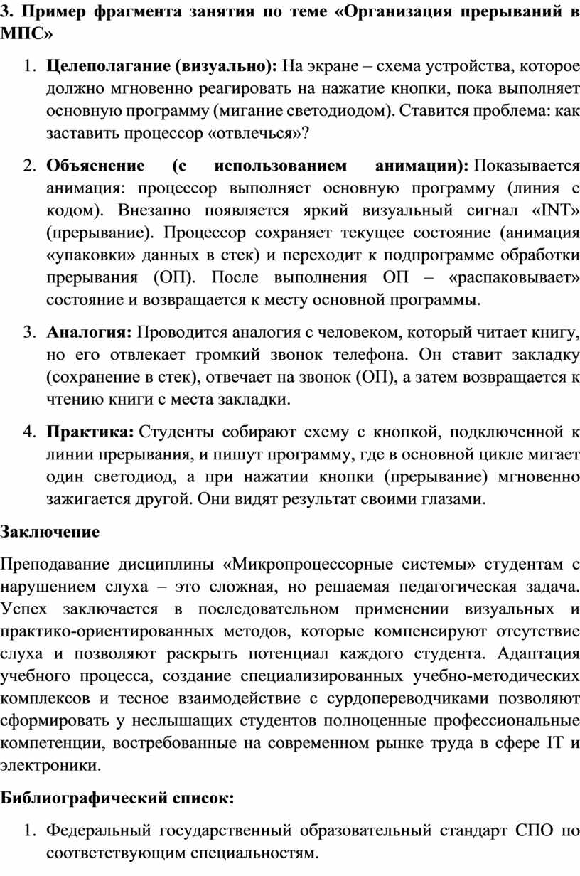 Преподавание дисциплины «Микропроцессорные системы» студентам с нарушением слуха – это сложная, но решаемая педагогическая задача. Успех заключается в последовательном применении визуальных и практико-ориентированных методов, которые компенсируют отсутствие слуха и позволяют раскрыть потенциал каждого студента. Адаптация учебного процесса, создание специализированных учебно-методических комплексов и тесное взаимодействие с сурдопереводчиками позволяют сформировать у неслышащих студентов полноценные профессиональные компетенции, востребованные на современном рынке труда в сфере IT и электроники.