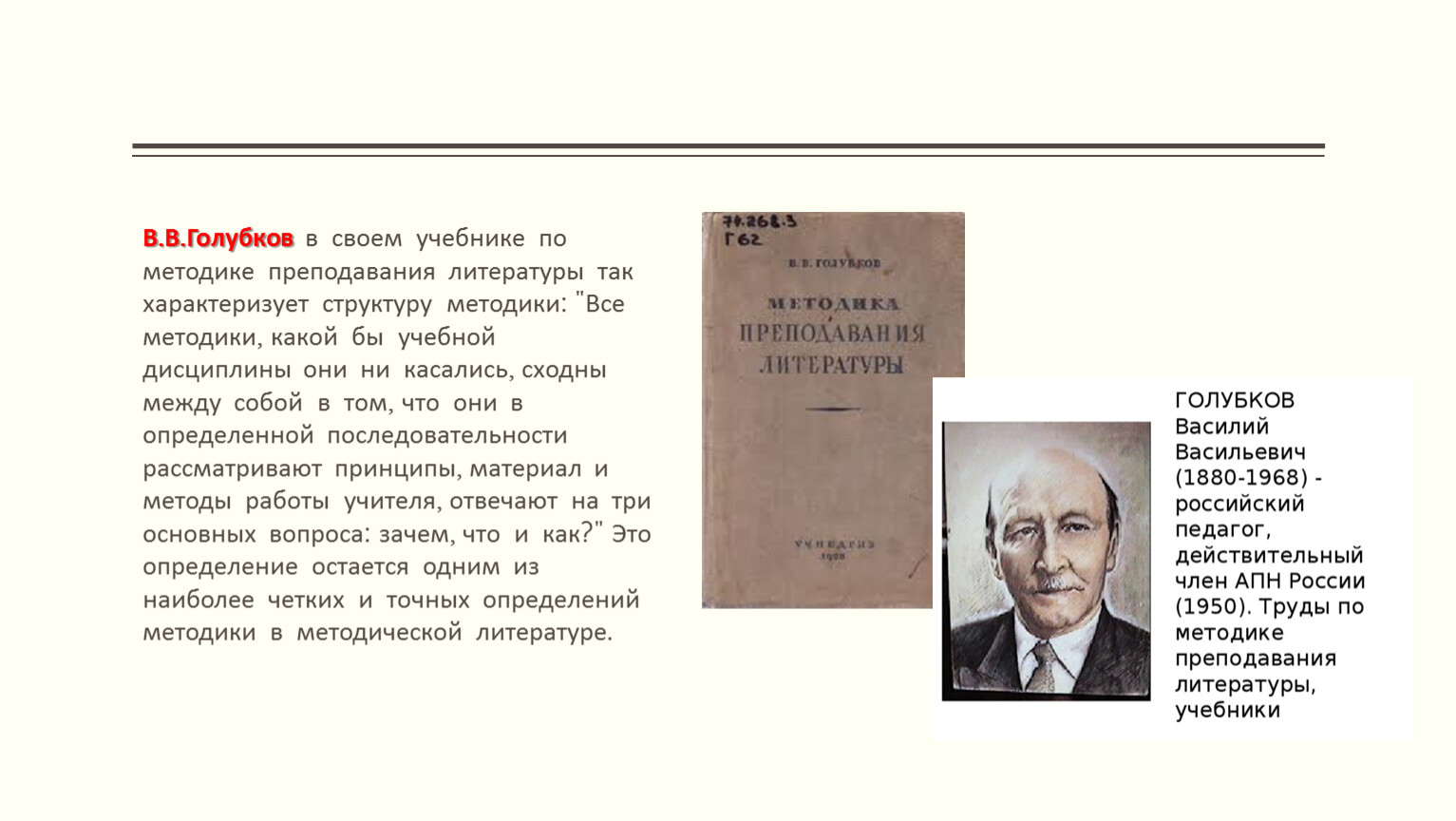 В.В.Голубков в своем учебнике по методике преподавания литературы так характеризует структуру методики: "Все методики, какой бы учебной