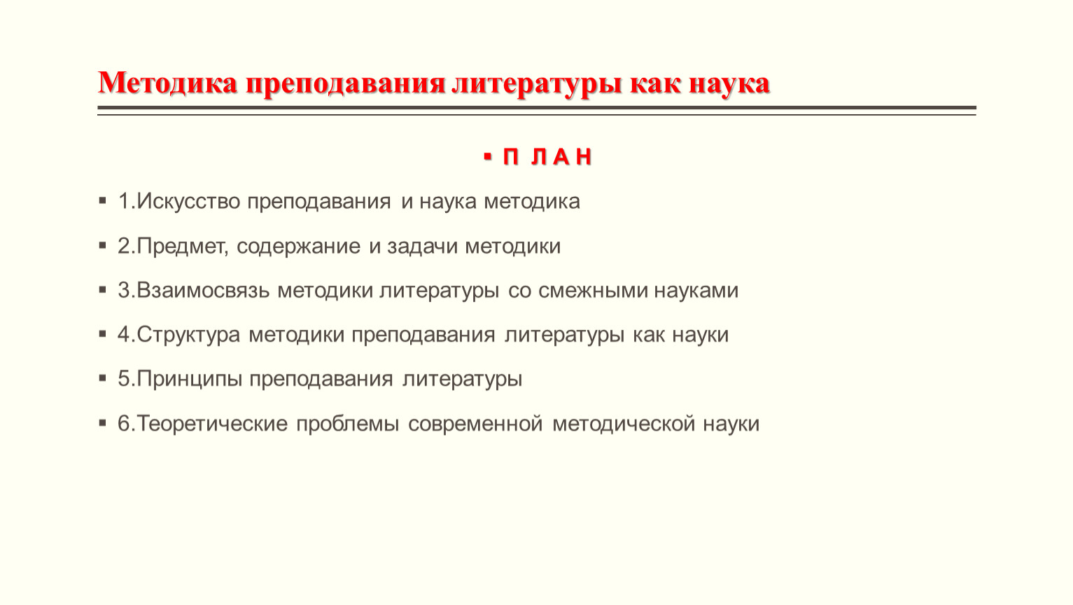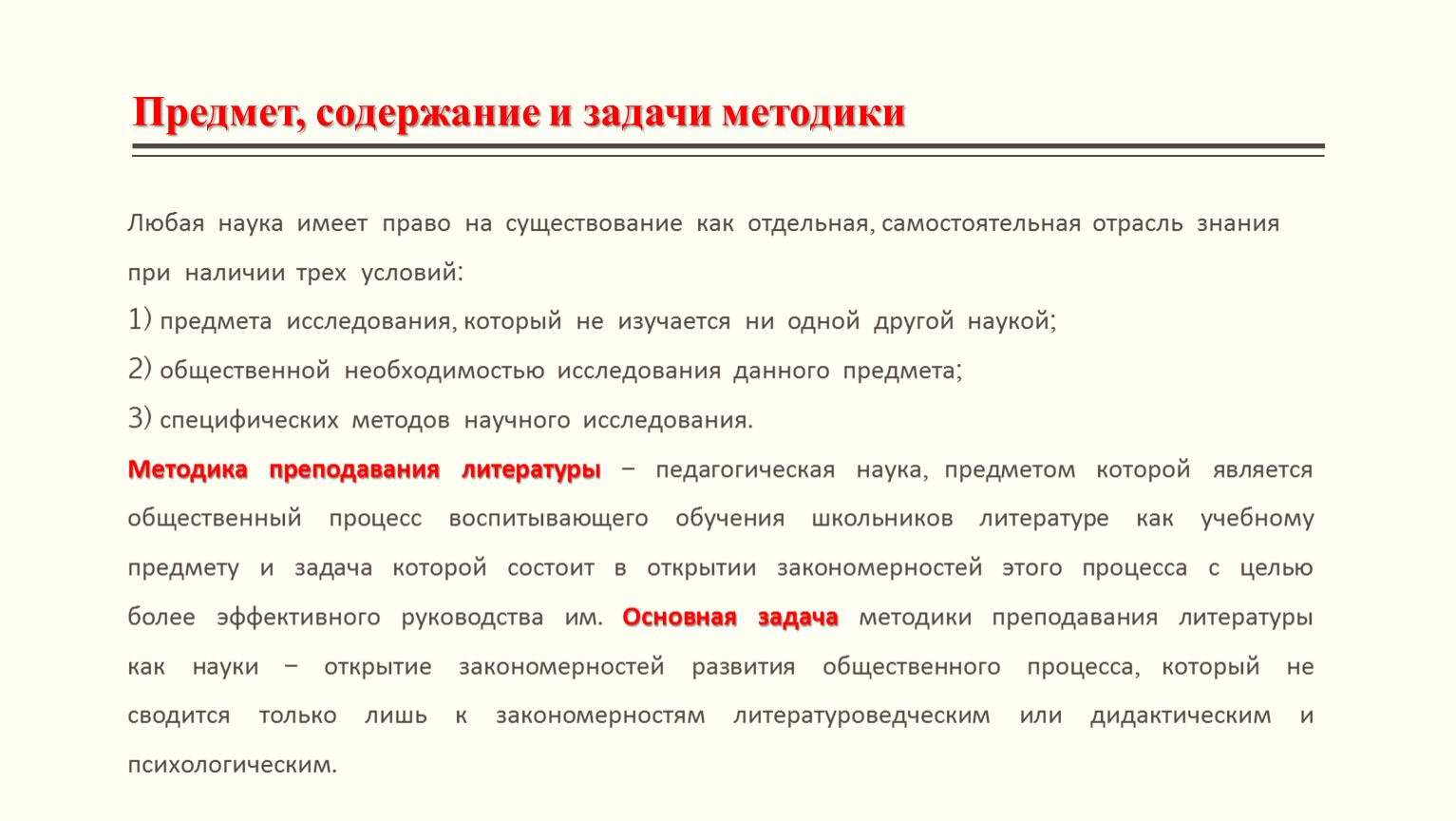 Методика преподавания литературы – педагогическая наука, предметом которой является общественный процесс воспитывающего обучения школьников литературе как учебному предмету и задача которой состоит в открытии закономерностей этого процесса с целью более эффективного руководства им. Основная задача методики преподавания литературы как науки – открытие закономерностей развития общественного процесса, который не сводится только лишь к закономерностям литературоведческим или дидактическим и психологическим.