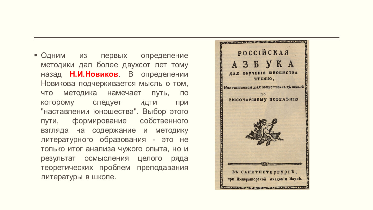 Одним из первых определение методики дал более двухсот лет тому назад Н.И.Новиков. В определении Новикова подчеркивается мысль о том, что методика намечает путь, по которому следует идти при "наставлении юношества". Выбор этого пути, формирование собственного взгляда на содержание и методику литературного образования - это не только итог анализа чужого опыта, но и результат осмысления целого ряда теоретических проблем преподавания литературы в школе.