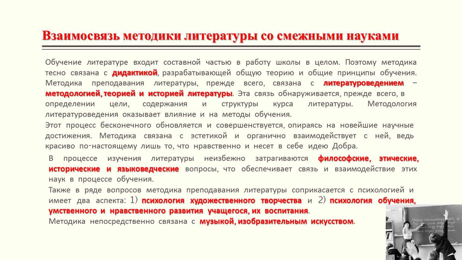 Обучение литературе входит составной частью в работу школы в целом. Поэтому методика тесно связана с дидактикой, разрабатывающей общую теорию и общие принципы обучения. Методика преподавания литературы, прежде всего, связана с литературоведением – методологией, теорией и историей литературы. Эта связь обнаруживается, прежде всего, в
