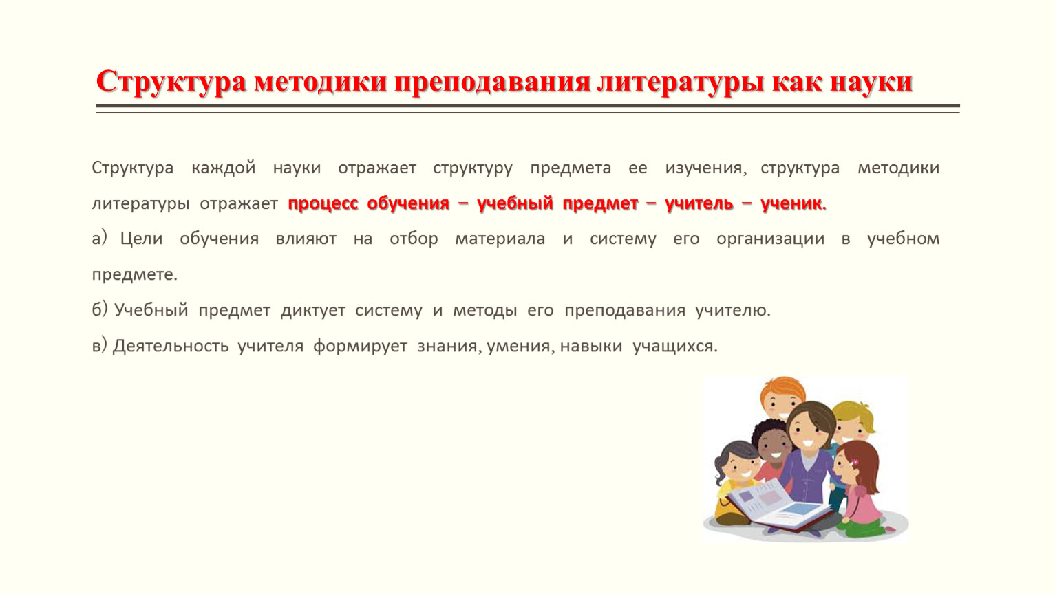 Структура каждой науки отражает структуру предмета ее изучения, структура методики литературы отражает процесс обучения – учебный предмет – учитель – ученик.