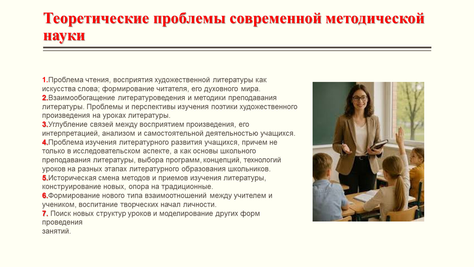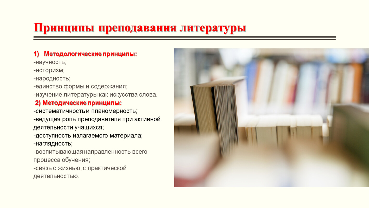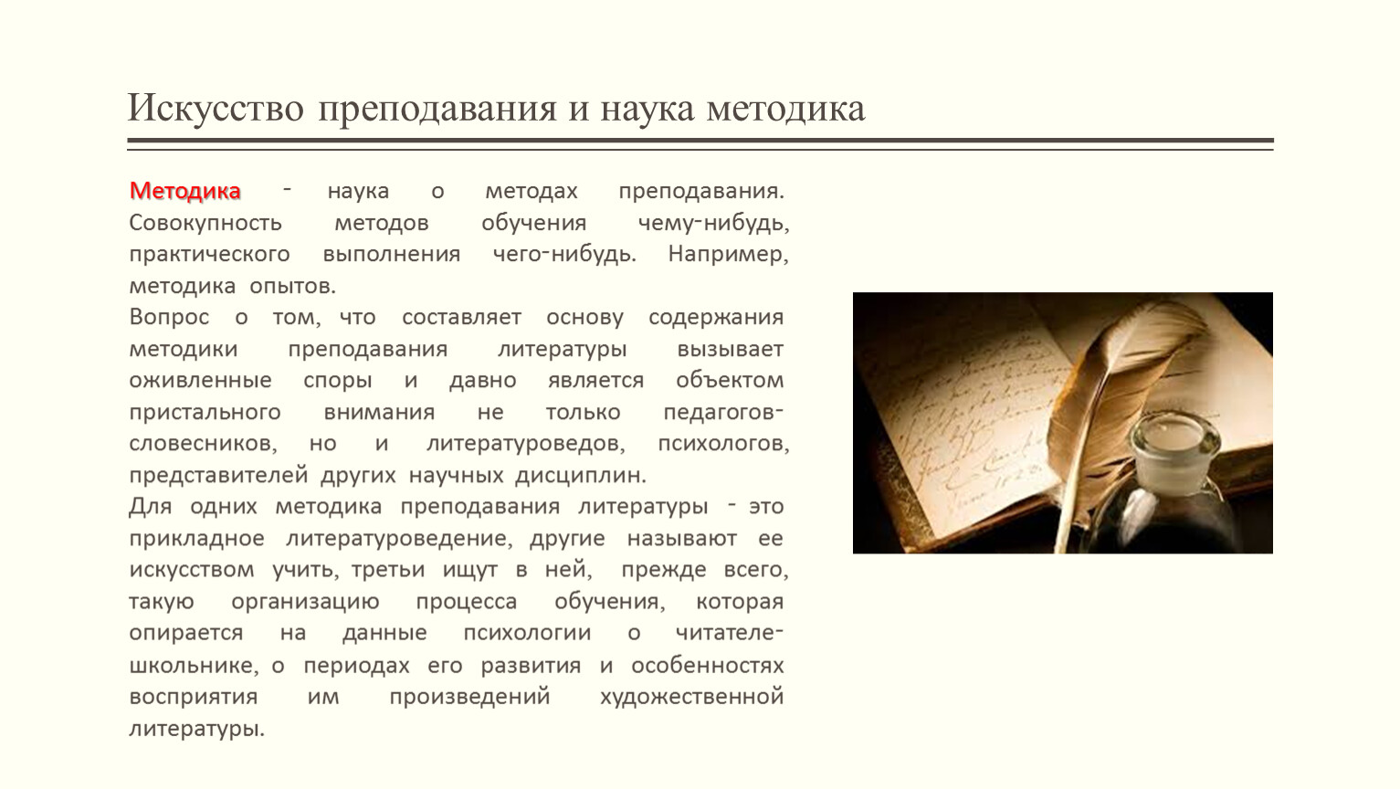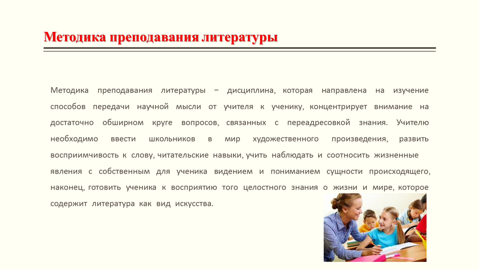 Методика преподавания литературы – дисциплина, которая направлена на изучение способов передачи научной мысли от учителя к ученику, концентрирует внимание на достаточно обширном круге вопросов, связанных с переадресовкой знания. Учителю необходимо ввести школьников в мир художественного произведения, развить восприимчивость к слову, читательские навыки, учить наблюдать и соотносить жизненные