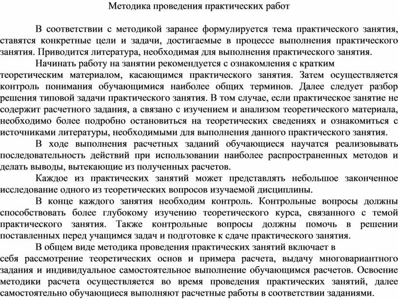 себя рассмотрение теоретических основ и примера расчета, выдачу многовариантного задания и индивидуальное самостоятельное выполнение обучающимся расчетов. Освоение методики расчета осуществляется во время проведения практических занятий, далее самостоятельно обучающиеся выполняют расчетные работы в соответствии заданиями.