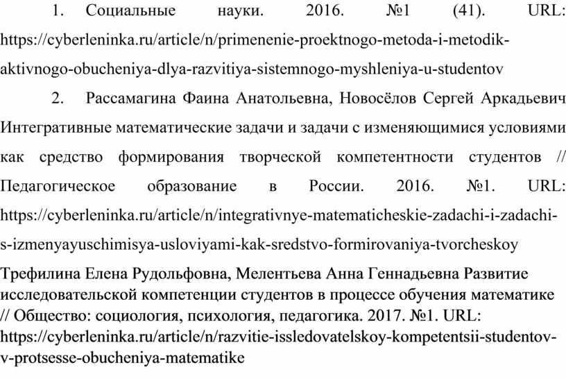 3. Трефилина Елена Рудольфовна, Мелентьева Анна Геннадьевна Развитие исследовательской компетенции студентов в процессе обучения математике // Общество: социология, психология, педагогика. 2017. №1. URL: https://cyberleninka.ru/article/n/razvitie-issledovatelskoy-kompetentsii-studentov-v-protsesse-obucheniya-matematike