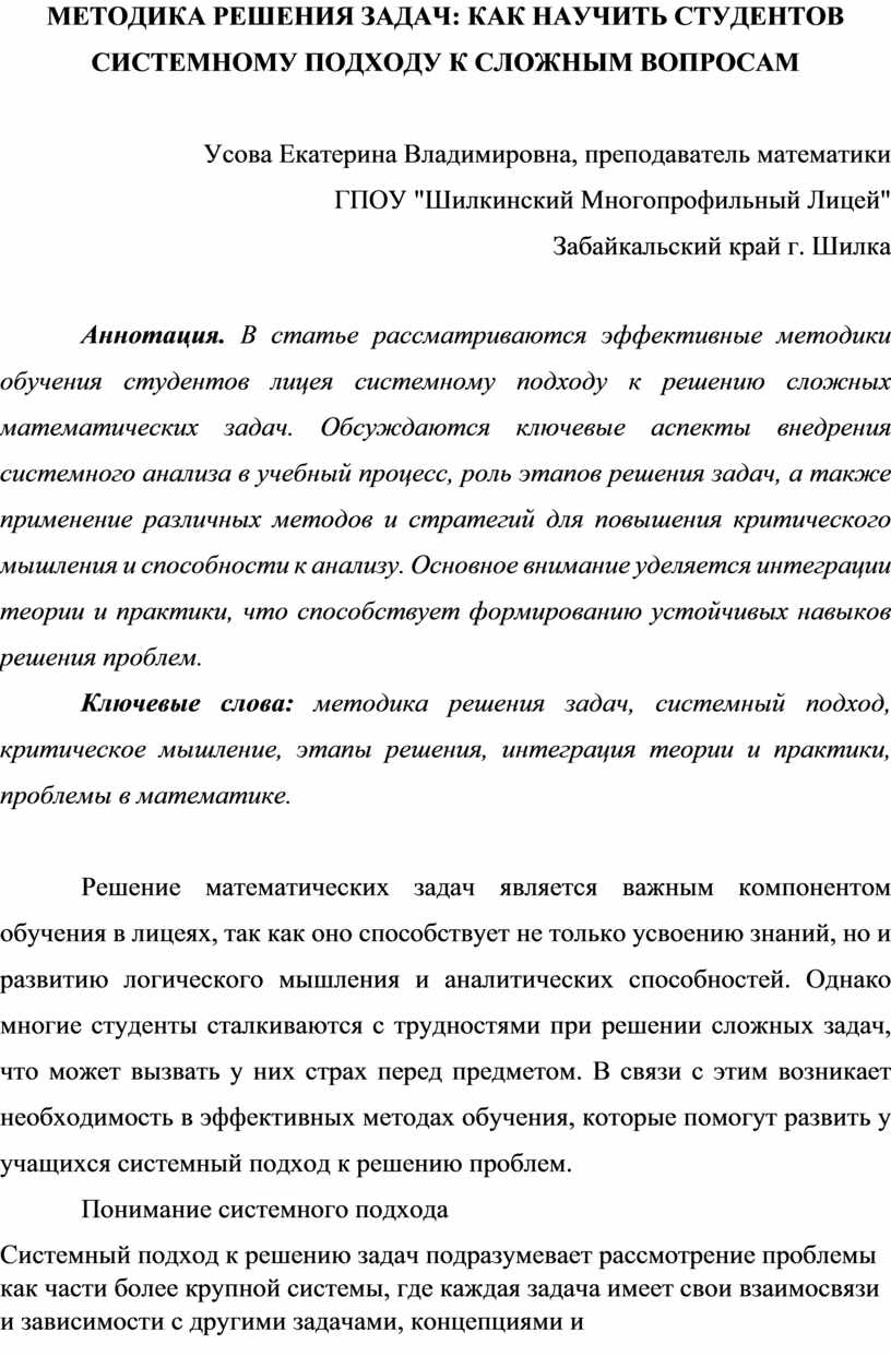 Ключевые слова: методика решения задач, системный подход, критическое мышление, этапы решения, интеграция теории и практики, проблемы в математике.