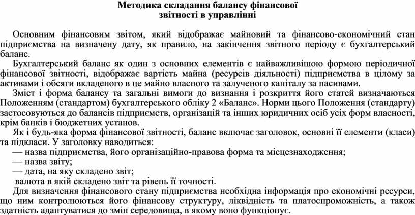 Зміст і форма балансу та загальні вимоги до визнання і розкриття його статей визначаються Положенням (стандартом) бухгалтерського обліку 2 «Баланс». Норми цього Положення (стандарту) застосовуються до балансів підприємств, організацій та інших юридичних осіб усіх форм власності, крім банків і бюджетних установ.