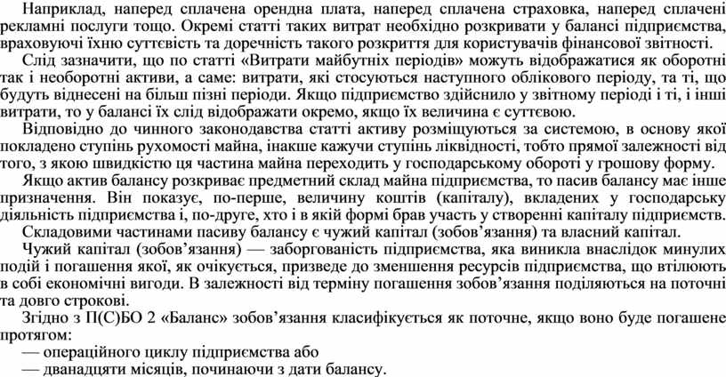 Наприклад, наперед сплачена орендна плата, наперед сплачена страховка, наперед сплачені рекламні послуги тощо. Окремі статті таких витрат необхідно розкривати у балансі підприємства, враховуючі їхню суттєвість та доречність такого розкриття для користувачів фінансової звітності.