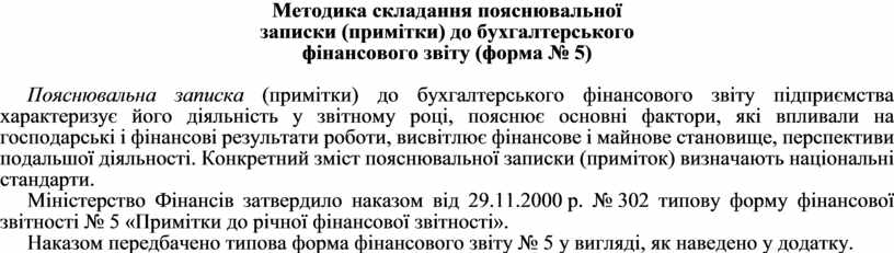 Міністерство Фінансів затвердило наказом від 29.11.2000 р. № 302 типову форму фінансової звітності № 5 «Примітки до річної фінансової звітності».