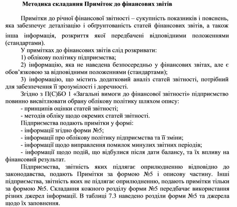 Підприємства, звітність яких підлягає оприлюдненню відповідно до законодавства, подають Примітки за формою №5 і описову частину. Інші підприємства, звітність яких не підлягає оприлюдненню, подають примітки тільки за формою №5. Складання кожного розділу форми №5 передбачає використання різних джерел інформації. В таблиці 7.3 наведено розділи форми №5 та джерела щодо їх заповнення.