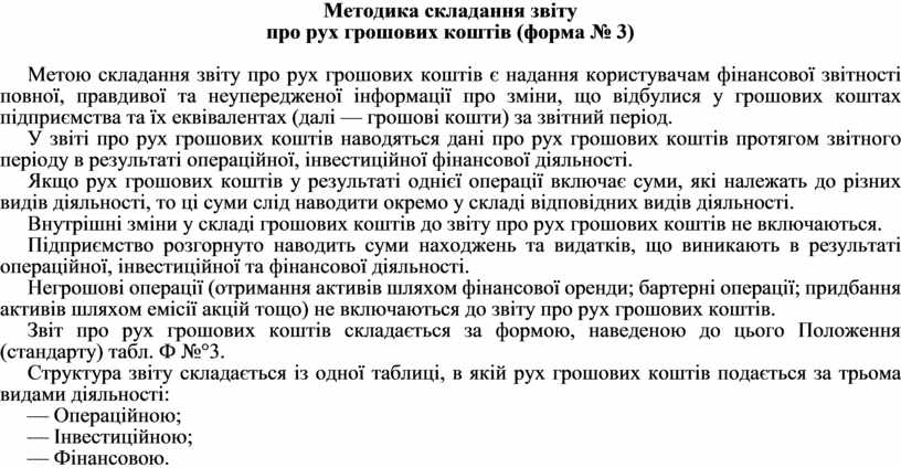 Звіт про рух грошових коштів складається за формою, наведеною до цього Положення (стандарту) табл. Ф №°3.