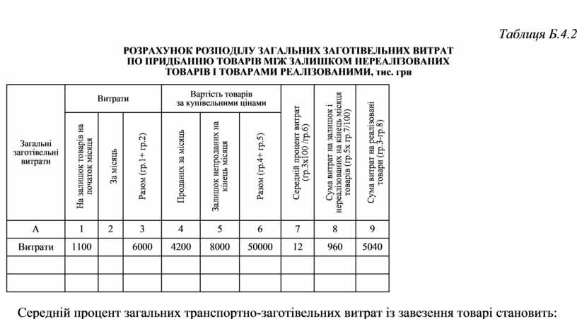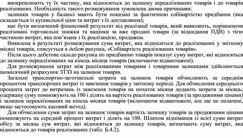 Для обчислення суми затрат на залишок товарів вартість залишку товарів за продажними цінами помножують на середній процент витрат і ділять на 100. Шляхом віднімання із всієї суми витрат обігу за місяць сум витрат, які відносяться до залишку товарів, визначають суму витрат, яка відноситься до товарів реалізованих (табл. Б.4.2).