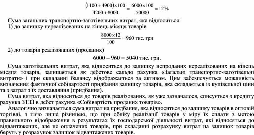 Витрати, обліковані на дебеті рахунка «Загальні транспортно-заготівельні витрати по придбанню товарів» періодично (раз у рік, квартал, щомісяця) списуються на результати діяльності торговельних підприємств. При цьому наприкінці кожного звітного місяця із загальної суми витрат виокремлюють ту їх частину, яка відноситься до залишку нереалізованих товарів і до товарів реалізованих. Необхідність такого розмежування зумовлена двома причинами: