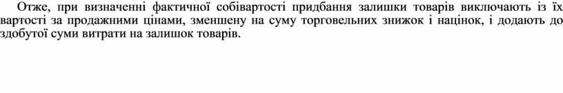Отже, при визначенні фактичної собівартості придбання залишки товарів виключають із їх вартості за продажними цінами, зменшену на суму торговельних знижок і націнок, і додають до здобутої суми витрати на залишок товарів.
