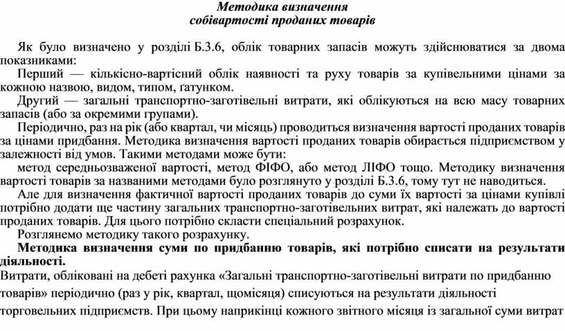 метод середньозваженої вартості, метод ФІФО, або метод ЛІФО тощо. Методику визначення вартості товарів за названими методами було розглянуто у розділі Б.3.6, тому тут не наводиться.