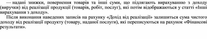 Після виконання наведених записів на рахунку «Дохід від реалізації» залишиться сума чистого доходу від реалізації продукту (товару, наданої послуги), які переписуються на рахунок «Фінансові результати».