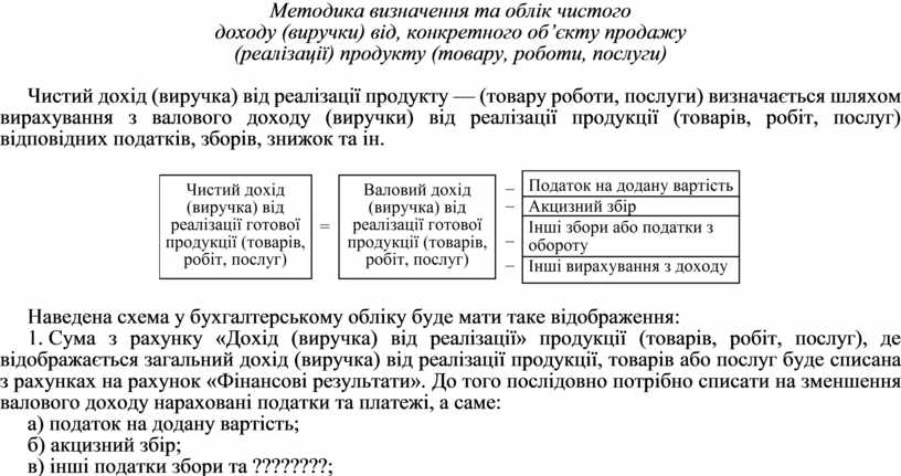 Чистий дохід (виручка) від реалізації продукту — (товару роботи, послуги) визначається шляхом вирахування з валового доходу (виручки) від реалізації продукції (товарів, робіт, послуг) відповідних податків, зборів, знижок та ін.