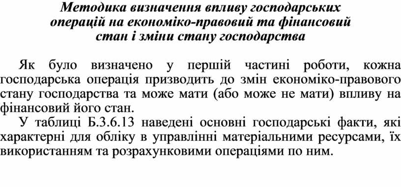 У таблиці Б.3.6.13 наведені основні господарські факти, які характерні для обліку в управлінні матеріальними ресурсами, їх використанням та розрахунковими операціями по ним.